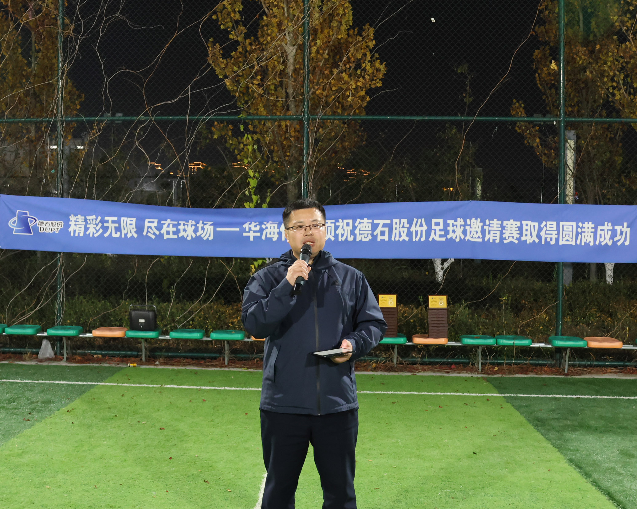 闭幕式上,德石股份公司董事、副总经理兼财务总监陈振先生作总结致辞。他指出,本届赛事不仅成功诠释了“友谊第一、比赛第二”的体育精神,更是德石股份“奋斗与争胜”文化底色的生动展现。 他表示,赛场上的团结、拼搏与进取,正是企业发展的核心动力。未来,公司将继续组织多元化的竞技活动,践行“认真工作,快乐生活”的理念,助力员工平衡工作与健康,并将赛场上的激情与协作精神转化为工作中的强大动力。最后,陈振总宣布德石股份首届足球邀请赛圆满结束!